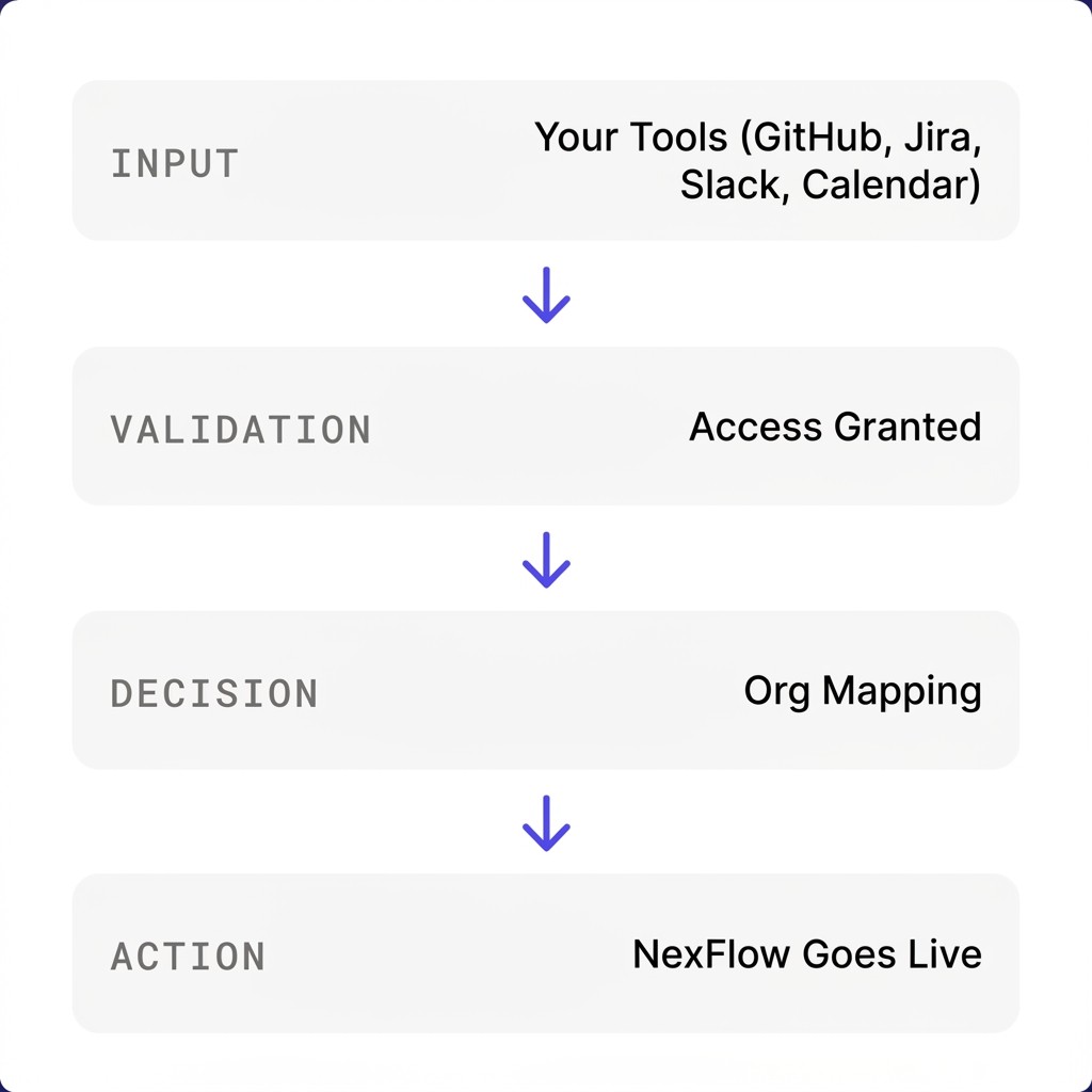 NexFlow currently connects to GitHub, Jira, Linear, Slack, and Google Calendar. If you use something that isn't listed, reach out. We're adding integrations regularly.