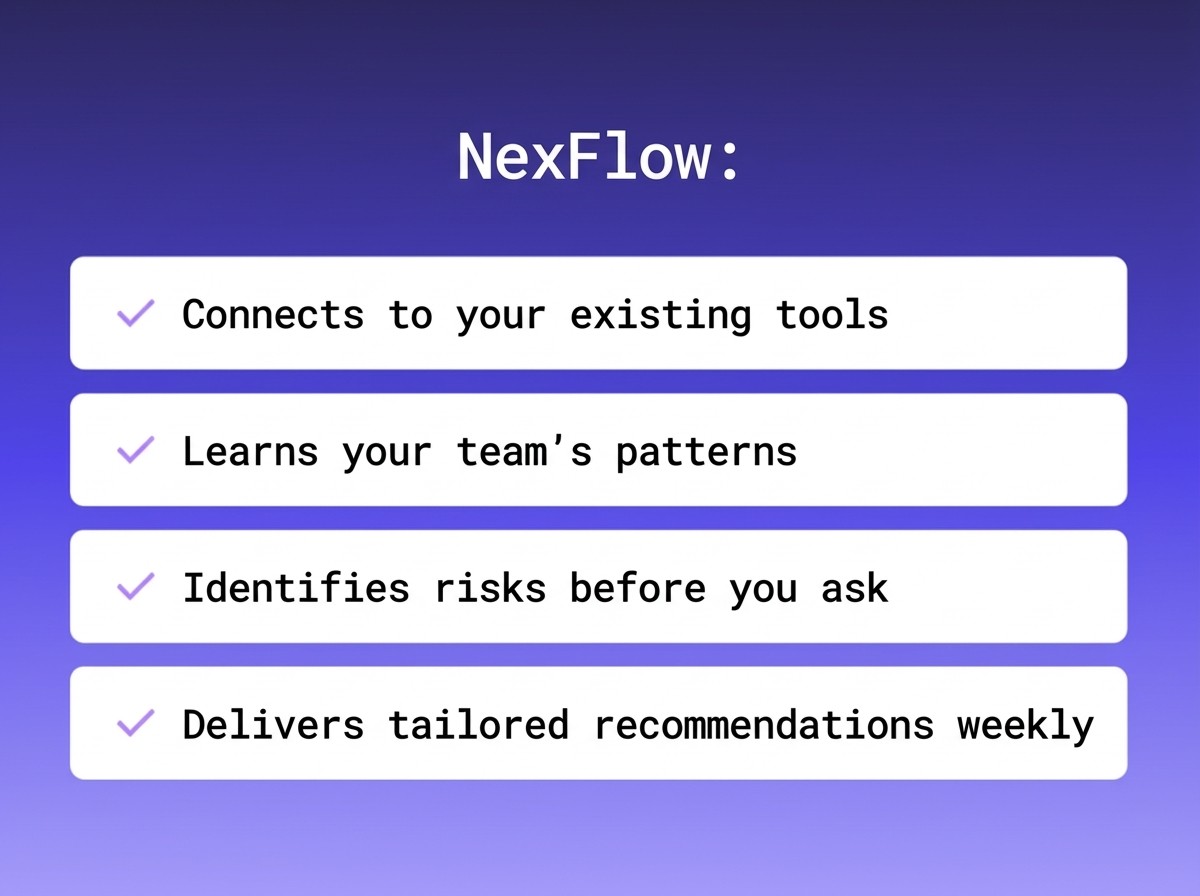NexFlow analyzes everything it sees across your tools and flags what needs your attention, before it becomes a problem.